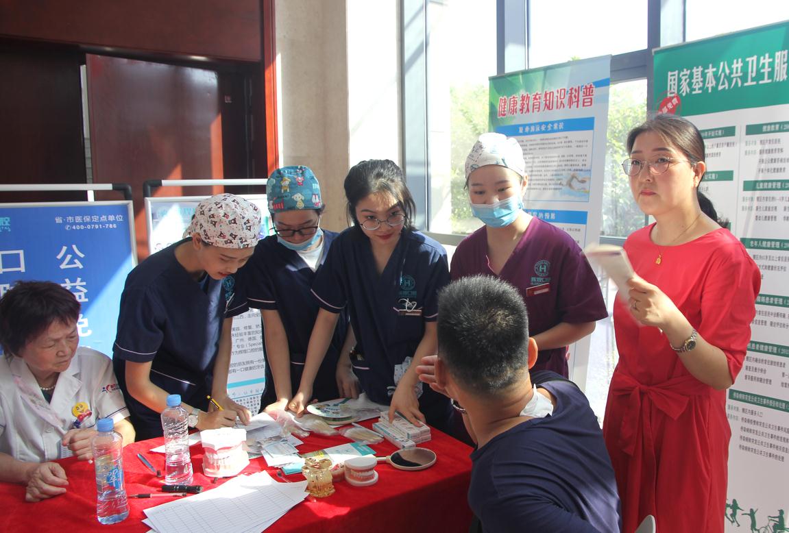 在第二个“中国医师节”到来之际,为了展示南昌市医师队伍风采、展示卫生健康事业的发展成果,同时组织医护队伍“走基层”更好的服务于人民健康事业。东湖区组织了“2019年东湖区第二个中国医师节暨大型义诊进机关活动”。应东湖区卫健委邀请,辉煌口腔与南昌市妇幼保健、健康体检、中医推拿等南昌市各大特色卫生医疗机构一起来到东湖区人民政府后广场,现场为东湖区政府机关干部进行卫生宣讲和健康诊断。